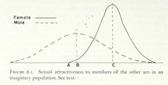 [average male (B) granted favour by most females, average female (C) is granting favour to most males, left of (A) are mostly incels.]