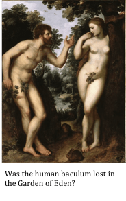 While the lack of a human penis bone may have interested evolutionary scientists for many years, it has recently attracted attention from professors of Theology as well. The debate was reignited in 2001 with the publication of a letter entitled Congenital human baculum deficiency: the generative bone of Genesis 2:21-23. Without wishing to delve into a religion vs. science debate, perhaps the most surprising aspect of this article is that it was published in the American Journal of Medical Genetics, with its central theory that God took Adam’s os penis to create Eve in the Garden of Eden, rather than his rib: