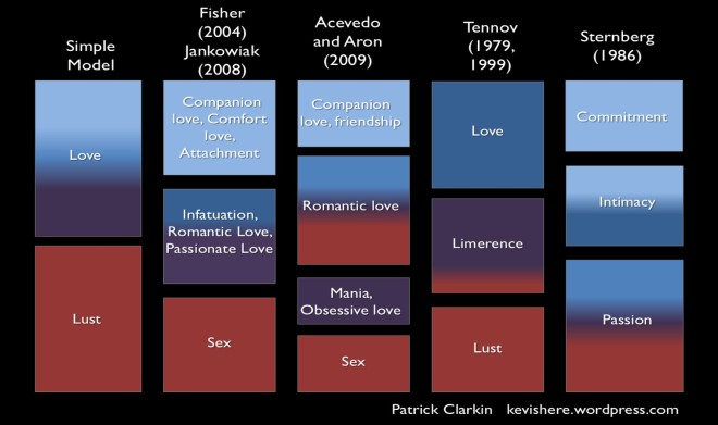 Sorting through some of the various taxonomies of love. Red = lust or sex drive. Purple = an obsessive quality, such as “intrusive thinking,” etc. Dark Blue = Romantic love. Light Blue = A calmer form of love (attachment, commitment, friendship). The list isn’t comprehensive, and in some categories I took some license with my reading of the author’s work, putting more than one element in a category. For example, Acevedo and Aron’s romantic love contains sex, romance, and a little obsession. But for them, obsession belongs mostly in its own category.