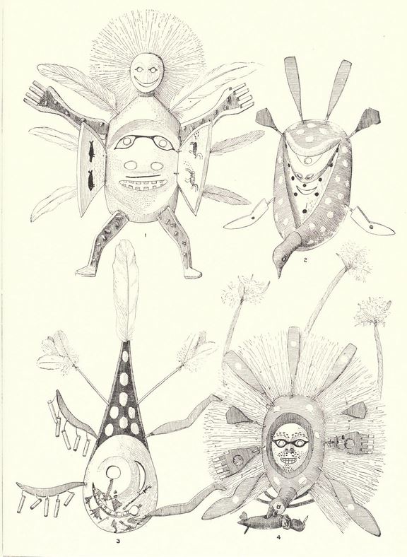Drawings of Alaskan ceremonial masks. From ‘The Eskimo about Bering Strait’ (1900) by Edward Nelson.