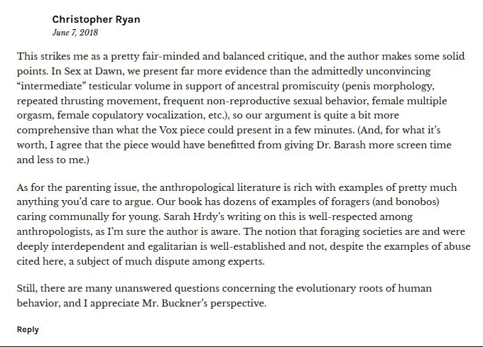 In case you missed it, I wrote an article for Quillette critiquing the first episode (titled ‘Monogamy, explained’) of Vox’s new Netflix series. Author Christopher Ryan was featured in that video, and he provided a very civil and thoughtful reply to my article in the comments section at Quillette.
