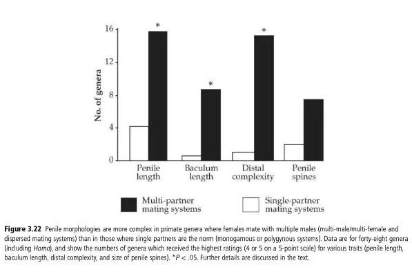 Ratings of penile complexity (length, distal complexity, size of baculum, and penile spines) show some consistent differences between these mating systems, as can be seen in Figure 3.22. Using a 5-point scale, each trait was rated for species representing forty-eight primate mate genera…Primates in which the females typically show multi-partner matings (multi-male/multi-female and dispersed mating systems) have significantly longer and distally more complex penes than representatives of polygynous or monogamous genera (Figure 3.22). They also tend to have longer bacula (when present) and larger penile spines, but these traits are more variable.