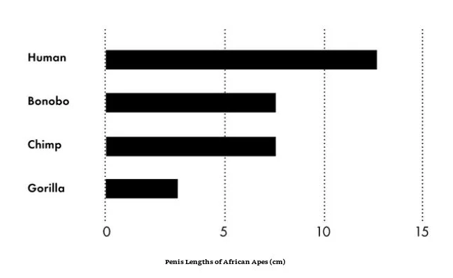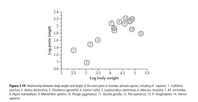 So the human penis is not uniquely long: it is roughly the same length as that of chimps and bonobos, and it scales with body size to about the same degree as most other primates. Its size is not particularly impressive.