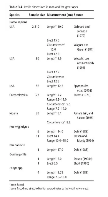 Regarding humans, “Human penile morphology is not exceptional when compared to that of the prosimians, monkeys, and apes. The overall rating for all four traits analysed is 10 for H. sapiens. This is the same rating as scored by a number of putatively monogamous or polygynous primates (e.g. Leontopithecus, Callimico, Erythrocebus, Theropithecus) and less than the ratings given to twenty-seven of the forty-eight primate genera included in the study.”