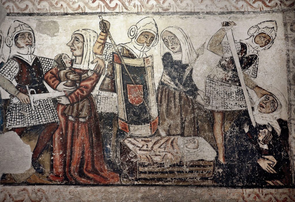 Massacre of the Innocents. Wall paintings of the central nave, 14th century. Detail. Mondoñedo Cathedral. Lugo province, Galicia, Spain.