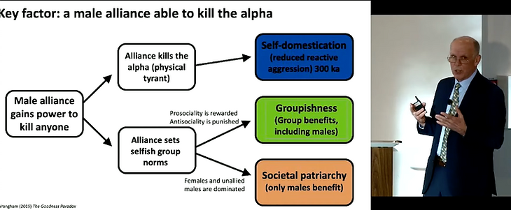 The alpha male alliance could have propagated laws that served their interests: “men must eat first”, “female adultery is immoral”. Wrangham maintains that even if some wives dominate their husbands, all societies have institutional patriarchy. Hence to truly understand patriarchy, we must focus on how it has been legally institutionalised by the alpha alliance.