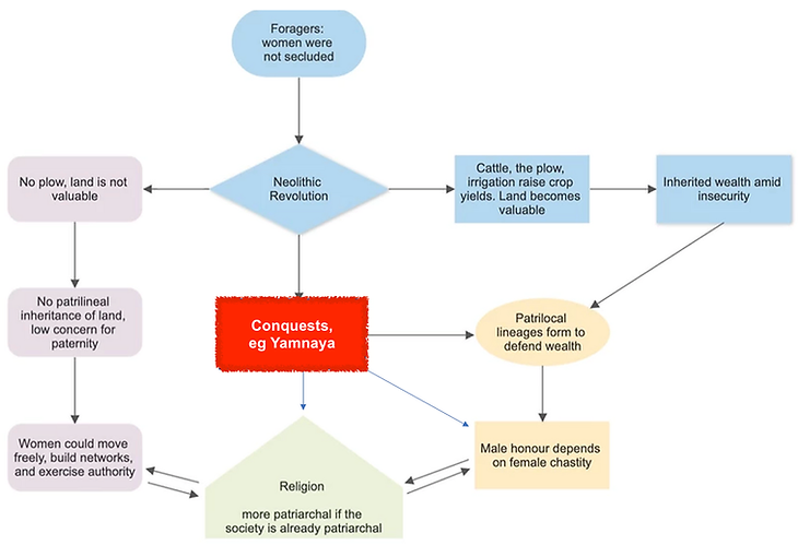 Over the past ten thousand years, there have been three major waves of patriarchy. These include conquest by Yamnaya steppe pastoralists, the emergence of inherited wealth amid insecurity, and male-organised religions (especially Islam). The stronger the reliance on kinship as well as the greater the concern for purity, the stricter the surveillance, inhibiting women’s freedoms and friendships.