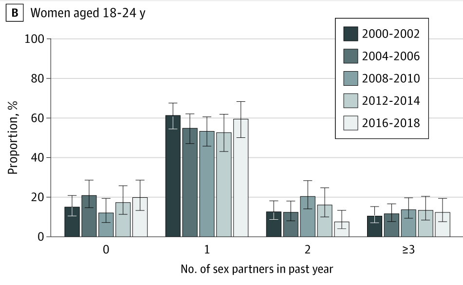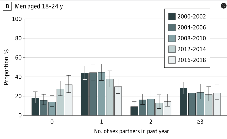 Between 2002 and 2018, the proportion of men aged 18 to 24 reporting no partnered sex in the past year spiked from 19 percent to 31 percent.